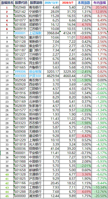 榜首前6和榜底后6,分化就非常明显。通过银行股涨幅排行榜,可以清晰感知到2026年当前的市场风格: