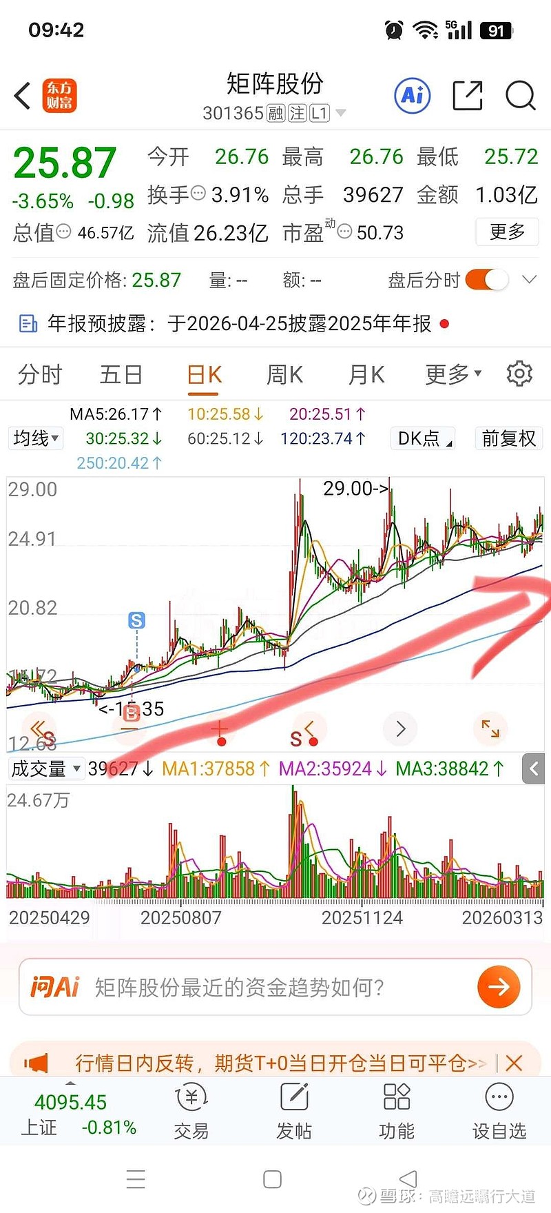 $矩阵股份(SZ301365)$ 创业板近端次新,是我最近比较青睐的板块,经过筛选后的票好处主要有三点:1、有强烈的诉求,特别是解禁前后,套用市场规则就是需求很大;2、主业财务数字稳定,没有什么突破,也没怎么亏欠,平地踏步为主;3、盘口小,创业板流动性好,没有什么基金,手握募集资金无处可花。那就好了,盘小无基有诉求,趋势线又完全向上,只有加速加速再加速了。去年七月曾短暂参与,没有启动就跑了。这时候资本运作该上场了,守株待兔