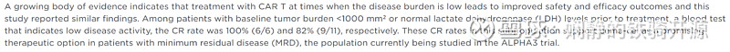 试验组:cema-cel 在 ALPHA1/2 低肿瘤负荷亚组(6 例)中 MRD 清除率 100%。在更广泛的人群中(包括不同 MRD 水平、不同 LDH、不同 IPI 评分的患者),预期 MRD 清除率可能在50%-55%。