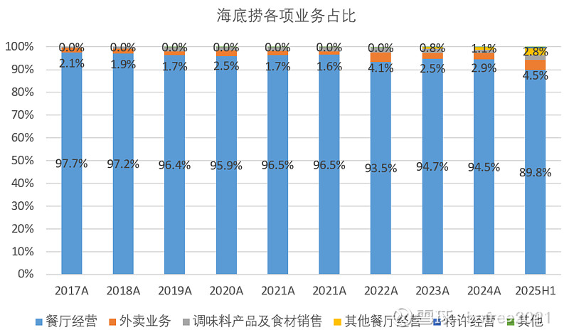 近两年,海底捞的业务构成开始出现变化,背后是在大店难拓的背景下海底捞探索新的增长点。从图中可以看到主营业务的变化。显然,海底捞的第二增长曲线就在外卖+其他餐厅经营+特许经营这三部分。2025年上半年,这三部分的收入占比为7.8%。等到这部分占比提高到10-15%,可能就会迎来一个拐点。何时能到无人可以精准预测,但张勇重回一线将加速这个拐点的到来。