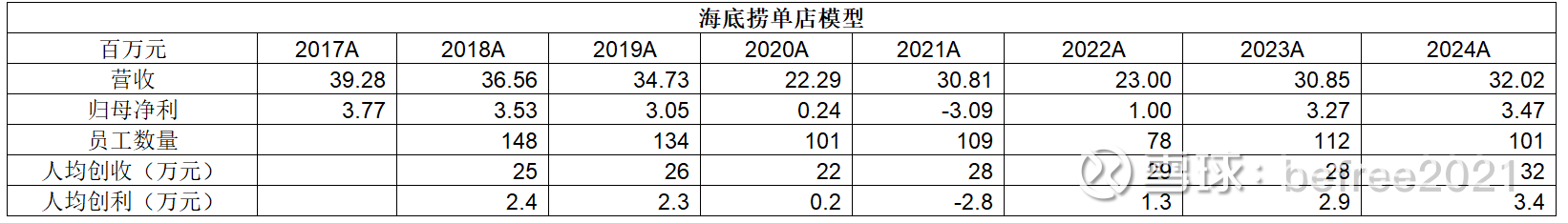 疫情以来,由于房价持续下行,国内面临t s压力,具体到海底捞身上,大家能直接想到的就是客单价下降,翻台率下降。但从人效的角度看,2024年海底捞人均创收28万,高于2019年22%;人均创利3.4万,