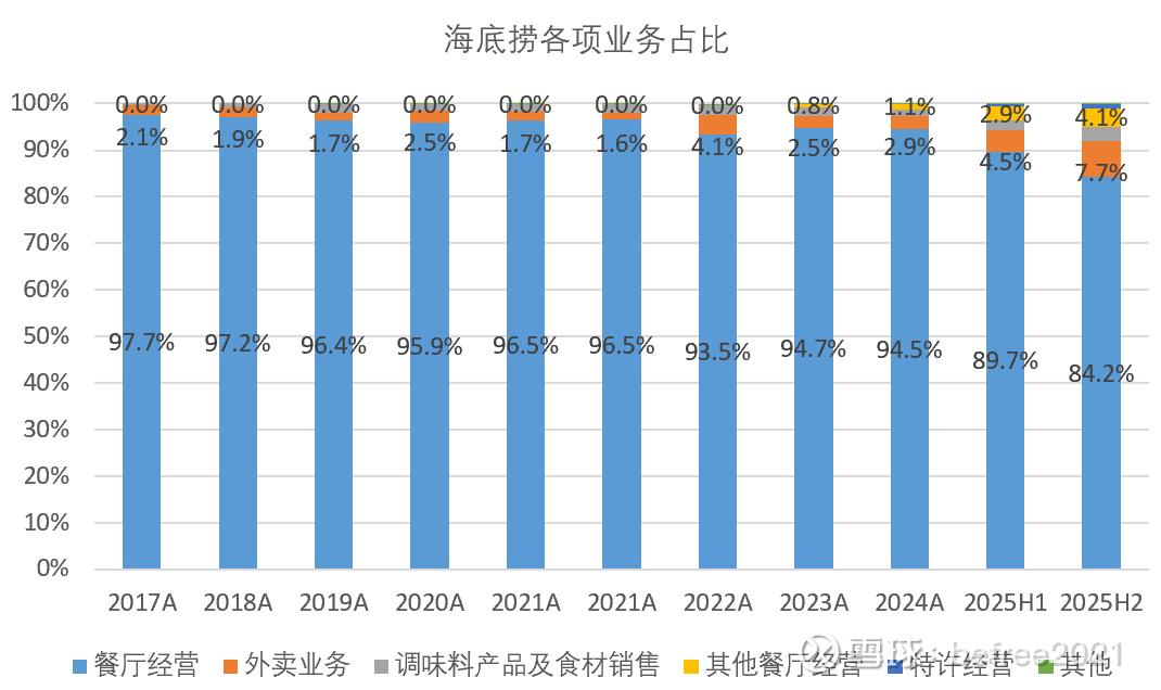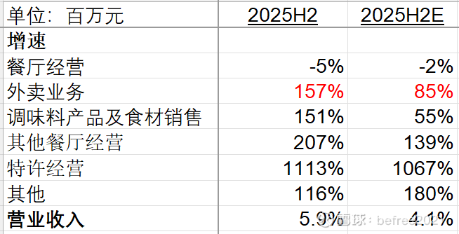 从下半年营收构成来看,餐厅经营外的其他业务占比为15.8%,比25H1提高了5个百分点。各项业务的增速都非常快,远超我之前的预期。如果增速再维持一个半年度,那么餐厅经营之外的业务贡献可以实质性影响公司了。