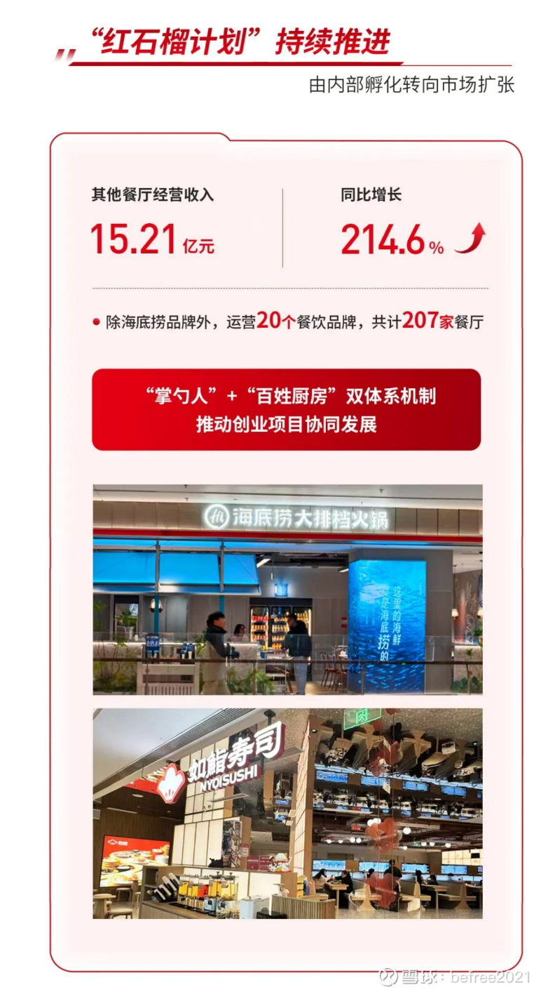 海底捞在公告里说红石榴计划升级,分为“掌勺人”和“百姓餐厅”。实质上就是增加了自上而下推的机制。这一点跟我想的不一样。我以为经过长时间的红石榴计划,公司找到了重点的模型,后续就主要推重点模型,比如海底捞大排档火锅、焰请、如鮨寿司、举高高。没想到还要继续搞新店型。试问,增加了自上而下的创业模式,那自下而上的品牌能推得动吗?一个是员工推的,一个是管理层推的,怎么可能会让员工推的项目获胜呢?结果只能是资源浪费。在我看来,就应该朝着有潜力的模型去倾尽资源,不要再继续分散精力了。看看后面公司会不会调整吧。