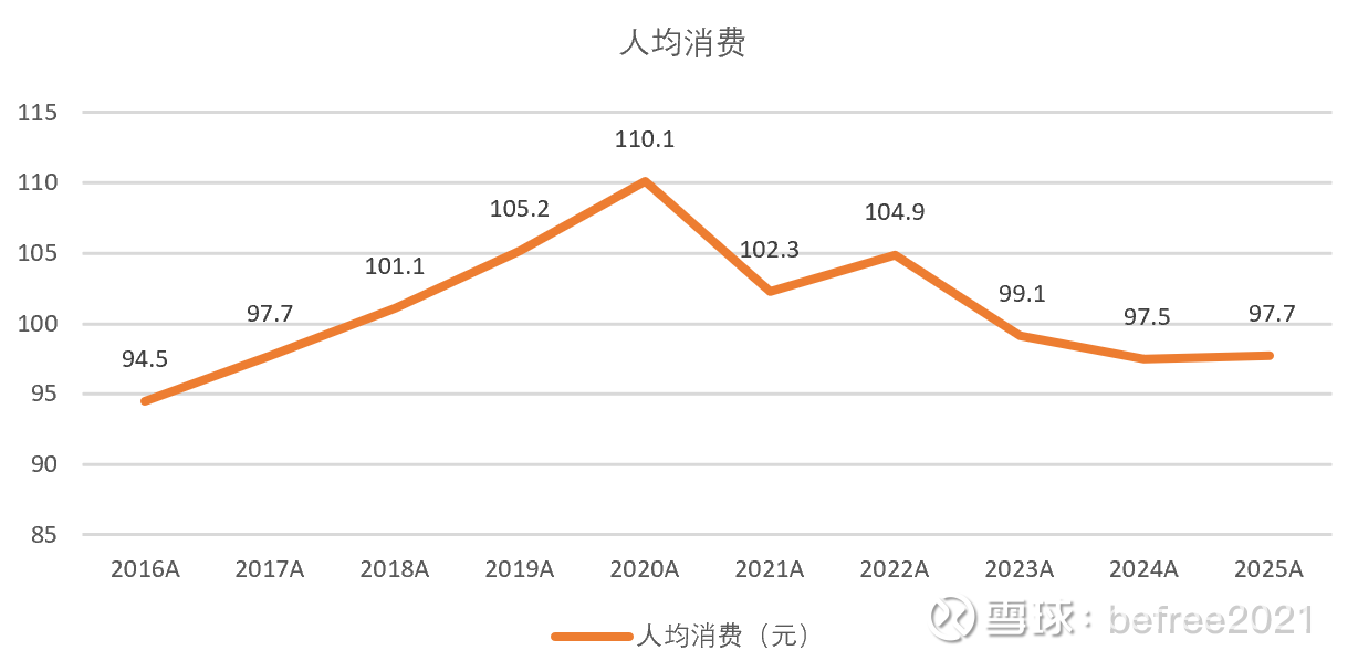 2025年,人均消费97.7元,略微上涨。25H1客单价是97.9元,客单价算是稳住下滑趋势了,算是一个好的迹象。现在牛羊肉涨价,CPI也上升至1%以上了。看看后续能不能传导至消费者端吧。