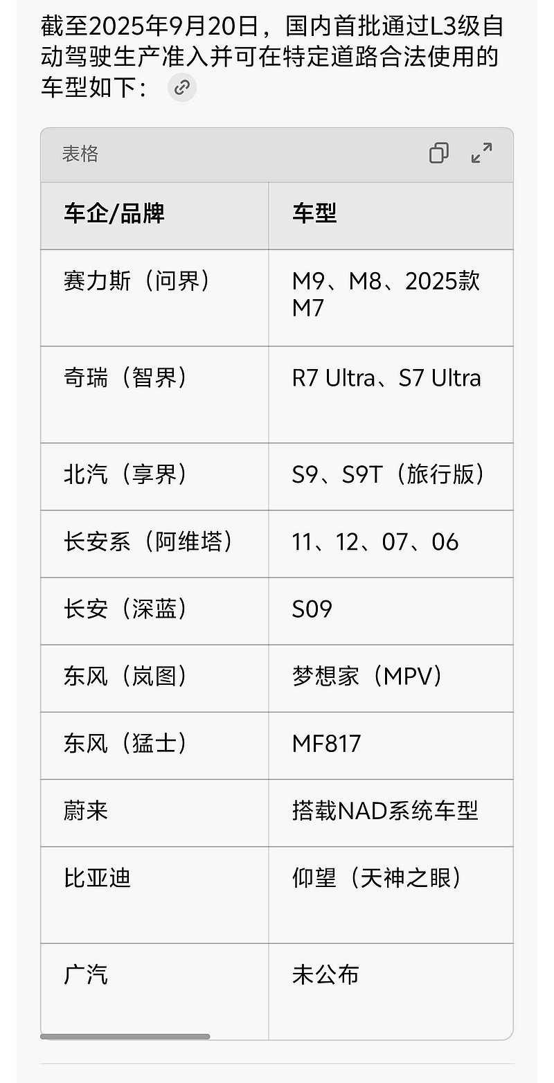 是的,又买回了一些智能驾驶的仓位,不是德赛也不是华阳,而是赛力斯。买入考虑以下几点:1.作为华为合作最为紧密的主机厂,无疑最受益L3法规落地。目前符合标准的名单我贴了个图,大家品一下。2.新款问界M7本月底正式上市。3.赛力斯其实也是机器人的主机厂之一,不过这部分最近没有信息更新,四季度也应该会有更多的新信息披露了。