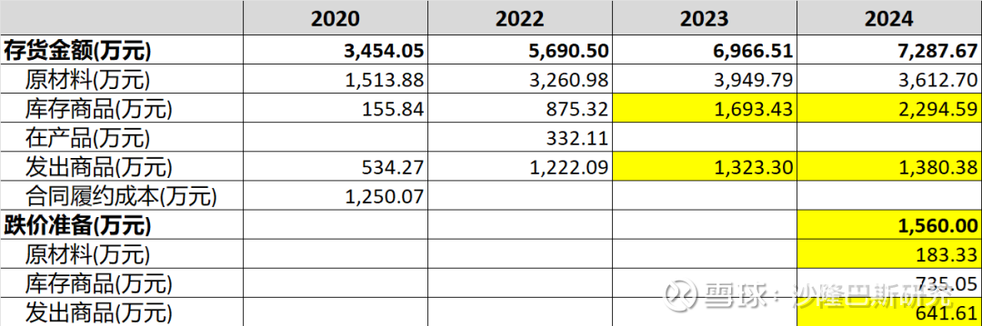 2024年原材料有所减少,但库存商品大幅增加,同时公司首次对库存商品和发出商品做了跌价准备