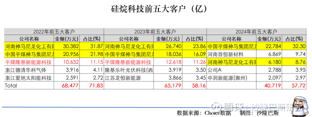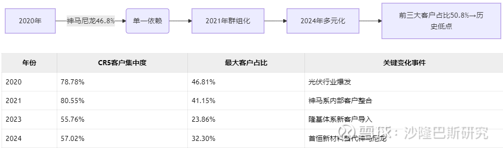 从2020-2024年之间看,公司的客户从单一客户依赖(2020年神马尼龙占比46.8%)到2021年群主化,2024呈现多元化。2020年公司是赶上了光伏的爆发,2023年是隆基的导入,2024年首恒新材料替代神马尼龙。