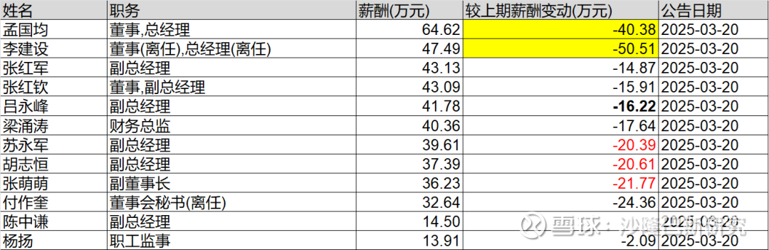 不过呢,国企的薪酬限制比较多,从公司2024年的薪酬变化看,发生了大幅降薪,李建设和孟国均降薪幅度均差不多40-50万之间,其他高管也降薪20万左右。