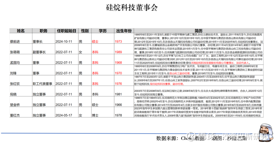 现任公司董事长为蔡前进,现任首山化工董事长,而他在2015年11月至2020年8月曾经担任任硅烷科技董事长。