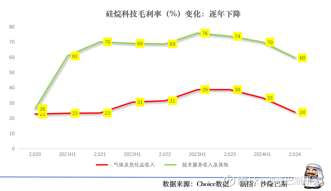 但是在2024年出现了较大的下滑。根据公司2024年年报。硅烷科技2024年实现营业收入7.01亿元,同比下降37.05%;归母净利润为7767.32万元,同比减少74.80%;扣非归母净利润为7039.47万元,同比减少75.03%;毛利率为24.09%,同比下降14.97个百分点;净利率为11.01%,较上年同期下降16.49个百分点。