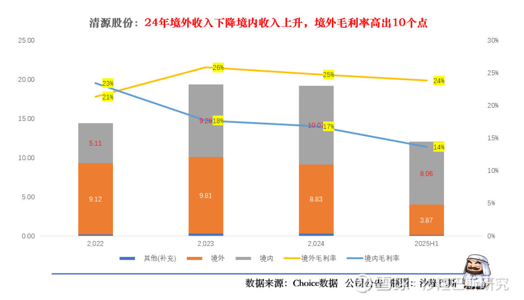 不过需要提醒的是,公司的境外毛利率一直维持在25%左右,区间变化不大,2025H1下降到23.81%。但是境内的毛利率却是不容乐观,从2022年的23.43%下降到2025H1的13.65%,足足下降10个百分点,境外与境内的毛利率差距在10个点左右。