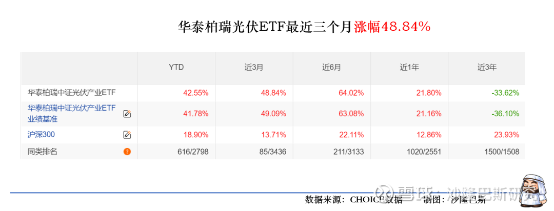 所以沙隆巴斯把目光放回到光伏行业,要有“光”,毕竟这是一个高度竞争且市场化的行业。光伏最近一个月ETF的涨幅也不错,比较大的华泰柏瑞光伏ETF最近三个月涨幅也是接近50%,如果光伏行业不好选择的话,建议还是配置ETF比较好,毕竟是板块性质的。