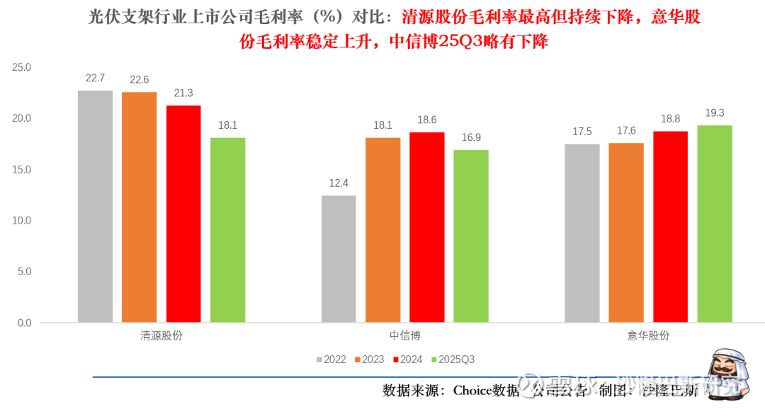 把公司毛利率与同行业上市公司放在一起对比,清源部分的毛利率平均22%左右,但是最近2年持续下降,中信博的毛利率比较稳定在18%左右,25Q3也略有下降,意华股份的毛利率倒是持续上升。