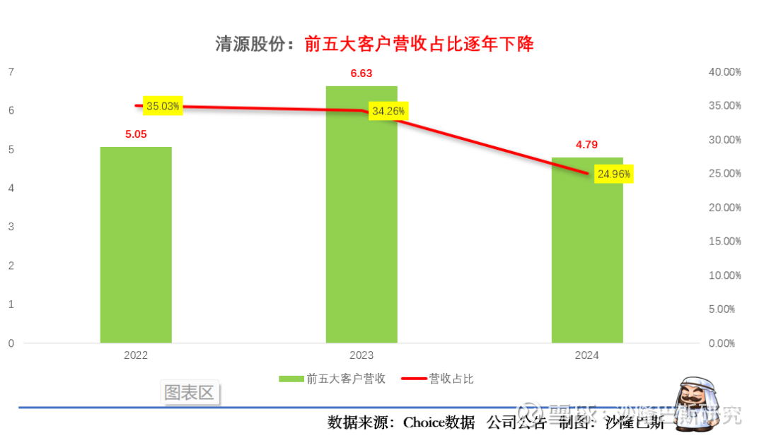 就最近三年的前五大客户营收数据看,2023年达到6.63亿元,是最近三年的最高峰,但是营收占比处于下降区间,从2022年的35%下降到2024年的24.96%。