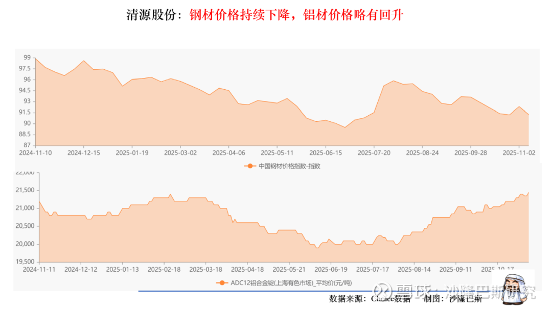 从价格趋势看,2024-2025年,钢材价格持续下降,但是铝材价格价格略有回升。