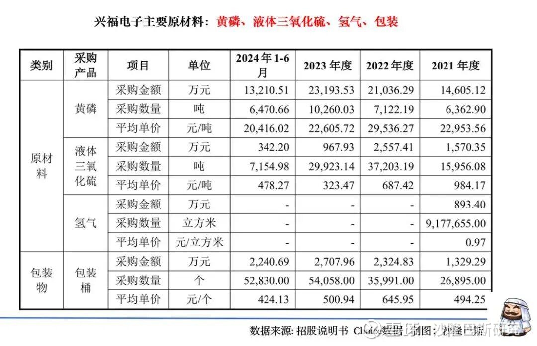 原材料:黄磷(电子级磷酸原料)、液体三氧化硫(电子级硫酸原料)、二甲基亚砜(DMSO)、氢氧化钾等。2021年至2023年兴发集团黄磷产量稳定在11万吨以上,兴福电子周边黄磷产能主要集中在兴发集团及其子公司。2021-2024,兴福电子采购黄磷占兴发集团及其子公司黄磷产量的比例分别为4.75%、2.93%、1.94%和0.11%。