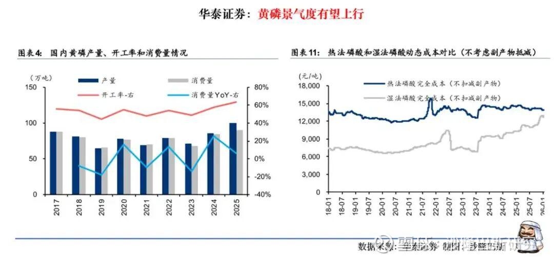 1月22日,华泰证券研报称,受益于下游磷酸及终端新能源正极材料、电子级磷酸和精细磷酸盐等需求增长,预计黄磷需求有望向好;且在硫磺、硫酸高价的情况下,热法磷酸较湿法磷酸的成本竞争力逐步凸显,或进一步推升热法工艺磷酸及黄磷的需求。供给端由于高能耗和安全环保等限制,国内严控黄磷新增产能(仅部分以产能置换等形式略有新增);且在双碳政策下,能耗较高的存量产能或面临出清等压力。在供需向好的情况下,预计黄磷景气有望上行,下游磷酸等景气亦或受带动。具备黄磷产能储备以及磷矿-黄磷-磷酸一体化的龙头企业将受益。
