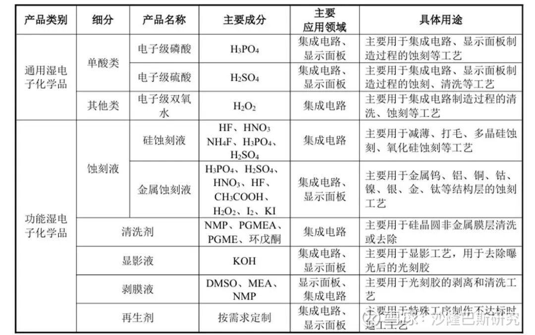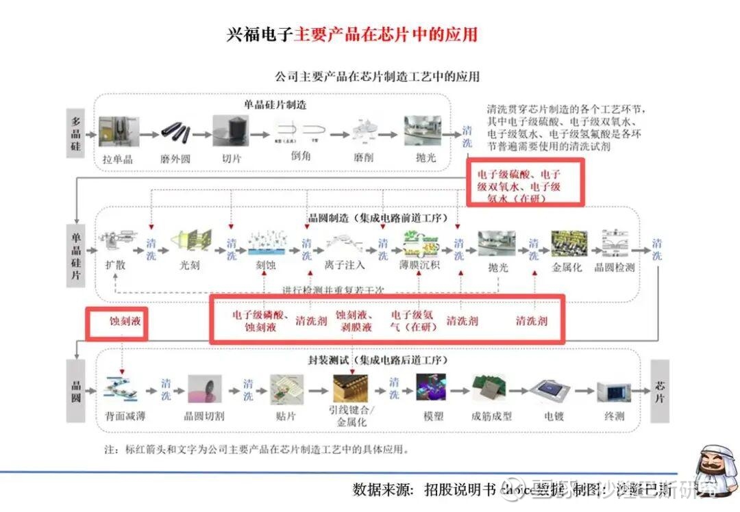 兴福电子的产品体系主要分为通用湿电子化学品和功能湿电子化学品两大类,主要应用于集成电路、显示面板等电子元器件的湿法工艺制程(如清洗、蚀刻、显影、剥离等)。