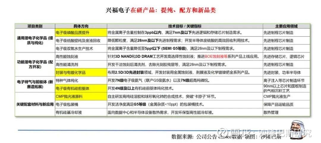公司目前的主要在研项目为通过提纯”巩固电子级磷酸、硫酸等基本盘的国际领先地位;另一方面通过“配方”和“新品类”(如清洗剂、特气、前驱体、抛光材料)深度绑定先进存储和逻辑芯片客户。