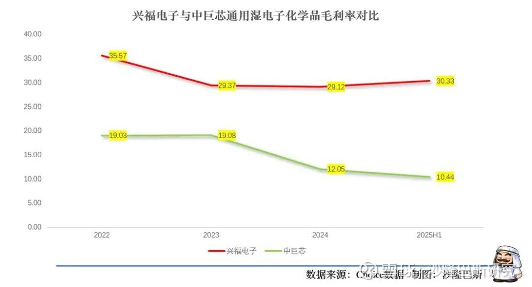 公司的竞争对手有很多,暂时把通用湿电子化学品毛利率与中巨芯做出同比,可以看出,兴福电子整体得益于一体化,整体毛利率还是高出很多。