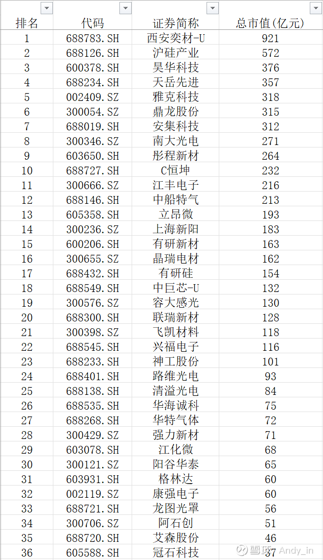 评估结果:NO.1 西安奕材;NO.2 天岳先进;NO.3 安集科技、NO.4 南大光电、NO.5 江丰电子