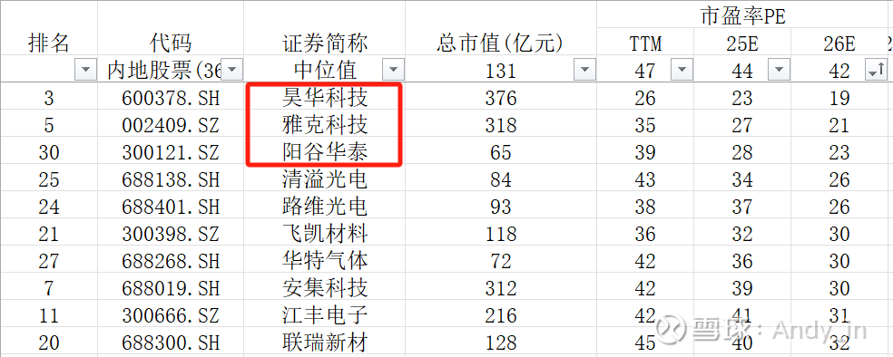 评估结果:NO.1 昊华科技、NO.2 雅克科技、NO.3 阳谷华泰、NO.4 清溢光电、NO.5 路维光电;但需注意前三者均有传统业务板块,导致整体估值水平拉低,列示前十供参考。