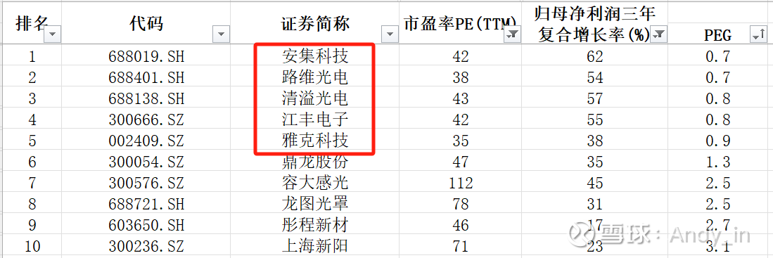 此处的PEG和标准的有偏差,“净利润年复合增长率(%)”通常指的是未来3到5年的年均净利润复合增长率!但受限于众多标本的盈利不可预测性,未保证数据客观公允性,使用过去3年的静态指标“归母净利润三年复合增长率(%)”。