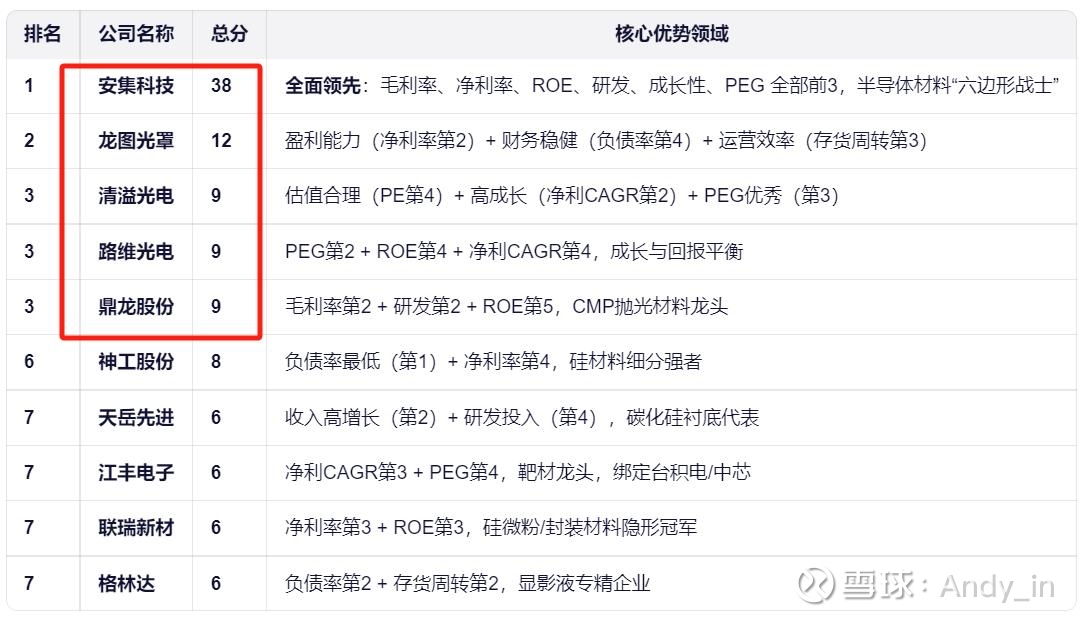 2、亚军:龙图光罩在盈利效率指标上表现出色,这也是我在本系列第一篇帖子中提到的龙图光罩因客观因素存在较大预期差,评分结果也不出所望。“随着2026年珠海工厂逐步放量以及早期投资机构减持压力释放,龙图光罩在明年一季度末至二季度有望迎来投资布局良机”;