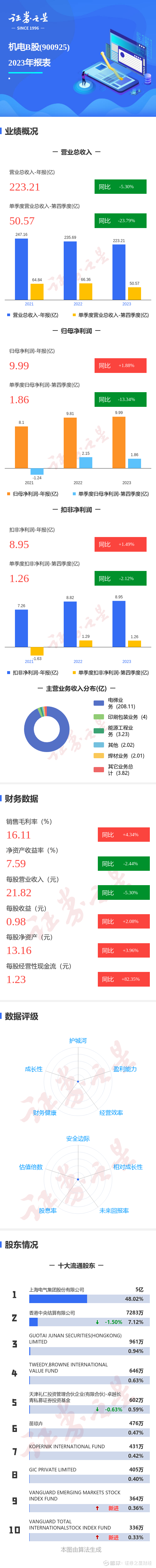 证券之星消息,机电B股2023年年报显示,公司主营收入223.21亿元,同比下降5.3%;归母净利润10.0亿元,同比上升1.88%;扣非净利润8.95亿元,同比上升1.49%;其中2023年第四季度,公司单季度主营收入50.58亿元,同比下降23.79%;单季度归母净利润1.87亿元,同比下降13.34%;单季度扣非净利润1.26亿元,同比下降2.12%;负债率56.45%,投资收益2.69亿元,财务费用-2.56亿元,毛利率16.11%。