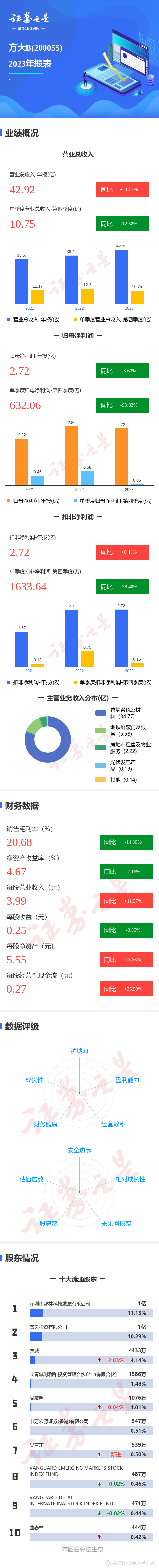 证券之星消息,方大B2023年年报显示,公司主营收入42.92亿元,同比上升11.57%;归母净利润2.73亿元,同比下降3.6%;扣非净利润2.72亿元,同比上升0.43%;其中2023年第四季度,公司单季度主营收入10.76亿元,同比下降12.58%;单季度归母净利润632.06万元,同比下降90.82%;单季度扣非净利润1633.64万元,同比下降78.48%;负债率54.88%,投资收益-456.21万元,财务费用7282.69万元,毛利率20.68%。