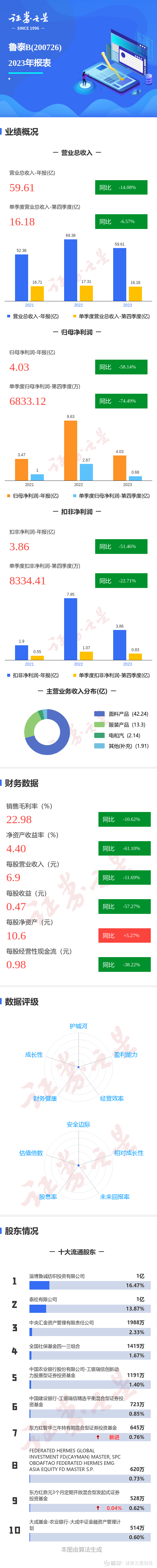证券之星消息,鲁泰B2023年年报显示,公司主营收入59.61亿元,同比下降14.08%;归母净利润4.03亿元,同比下降58.14%;扣非净利润3.86亿元,同比下降51.46%;其中2023年第四季度,公司单季度主营收入16.18亿元,同比下降6.57%;单季度归母净利润6833.13万元,同比下降74.49%;单季度扣非净利润8334.42万元,同比下降22.71%;负债率28.39%,投资收益3936.46万元,财务费用544.88万元,毛利率22.98%。
