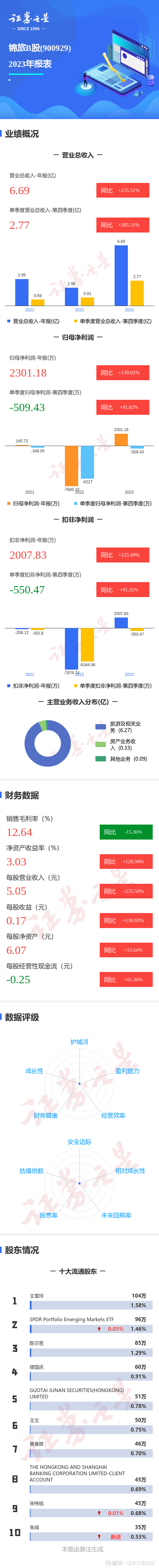 应收款项变动幅度为98.99%,原因:旅游业务恢复,应收客户款项增加。预付款项变动幅度为398.78%,原因:旅游业务恢复,预付供应商款项增加。其他应收款变动幅度为72.15%,原因:旅游业务恢复,垫付日常经营款项增加。在建工程变动幅度为-79.03%,原因:项目完工结转。使用权资产变动幅度为5636.26%,原因:本年有新增租赁,以新租赁准则计量。无形资产变动幅度为126.47%,原因:本年信息化建设新增业务软件。长期待摊费用变动幅度为-45.29%,原因:软件服务费本年摊销。递延所得税资产变动幅度为-100.0%,原因:其他权益工具投资公允价值上升,计提的递延所得税负债与递延所得税资产互抵。应付账款变动幅度为63.02%,原因:旅游业务恢复,应付供应商款项增加。合同负债变动幅度为73.06%,原因:旅游业务恢复,预收客户款项增加。应付职工薪酬变动幅度为-51.12%,原因:去年计提的辞退福利的长期部分重分类至长期应付职工薪酬。应交税费变动幅度为135.57%,原因:旅游业务恢复,应交增值税增加。一年内到期的非流动负债变动幅度为5801.06%,原因:新增租赁以新租赁准则计量产生的租赁负债,根据到期时间重分类至此。递延所得税负债的变动原因:本期其他权益工具投资公允价值上升,计提的递延所得税负债增加。其他综合收益变动幅度为1590.35%,原因:其他权益工具投资公允价值变动增加。营业收入变动幅度为235.51%,原因:旅游业务恢复。营业成本变动幅度为244.56%,原因:旅游业务恢复。税金及附加变动幅度为66.38%,原因:旅游业务恢复。管理费用变动幅度为-53.59%,原因:去年公司实施员工安置方案,计提辞退福利,本年无此影响因素。财务费用变动幅度为530.36%,原因:本年利息收入减少及汇兑差额增加。其他收益变动幅度为36.77%,原因:本期收到的政府补助增加。所得税费用变动幅度为-139.09%,原因:本期递延所得税费用影响。少数股东损益变动幅度为59.14%,原因:本年业务恢复,控股子公司亏损减少。经营活动产生的现金流量净额变动幅度为65.36%,原因:今年旅游业务恢复、经营现金流入增加,及去年公司实施员工安置方案、支付内退及协解人员相关费用。筹资活动产生的现金流量净额变动幅度为-514.62%,原因:本年购买子公司少数股权。财报数据概要请见下图: