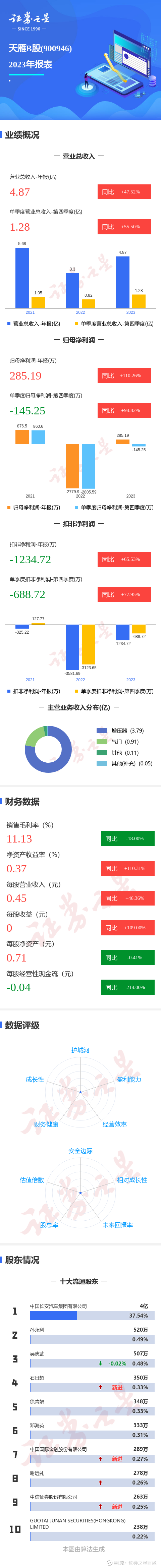 证券之星消息,天雁B股2023年年报显示,公司主营收入4.88亿元,同比上升47.52%;归母净利润285.2万元,同比上升110.26%;扣非净利润-1234.73万元,同比上升65.53%;其中2023年第四季度,公司单季度主营收入1.29亿元,同比上升55.5%;单季度归母净利润-145.26万元,同比上升94.82%;单季度扣非净利润-688.72万元,同比上升77.95%;负债率38.18%,财务费用-393.91万元,毛利率11.13%。