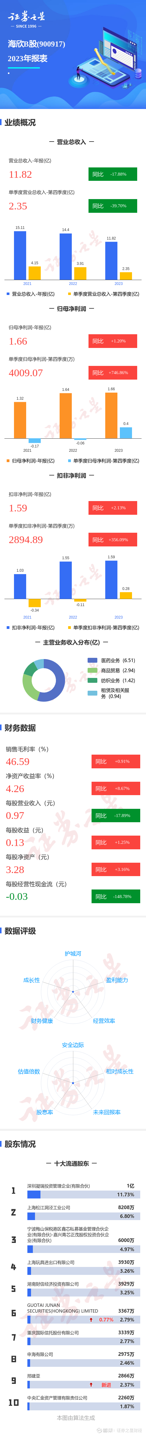 证券之星消息,海欣B股2023年年报显示,公司主营收入11.83亿元,同比下降17.88%;归母净利润1.66亿元,同比上升1.2%;扣非净利润1.59亿元,同比上升2.13%;其中2023年第四季度,公司单季度主营收入2.36亿元,同比下降39.7%;单季度归母净利润4009.08万元,同比上升746.86%;单季度扣非净利润2894.9万元,同比上升356.09%;负债率15.79%,投资收益1.55亿元,财务费用-707.32万元,毛利率46.59%。