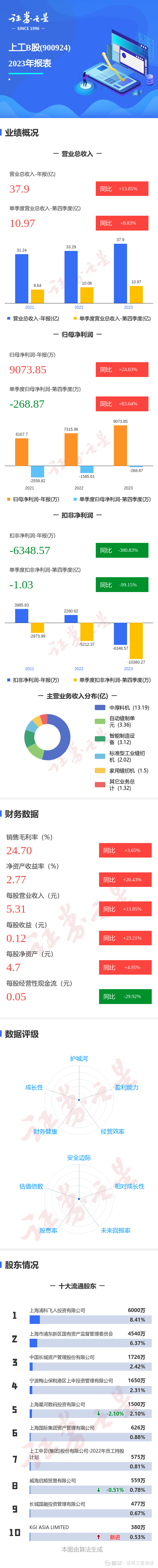 证券之星消息,上工B股2023年年报显示,公司主营收入37.9亿元,同比上升13.85%;归母净利润9073.86万元,同比上升24.03%;扣非净利润-6348.58万元,同比下降380.83%;其中2023年第四季度,公司单季度主营收入10.97亿元,同比上升8.83%;单季度归母净利润-268.88万元,同比上升83.04%;单季度扣非净利润-1.04亿元,同比下降99.15%;负债率39.26%,投资收益-8979.47万元,财务费用5005.41万元,毛利率24.7%。