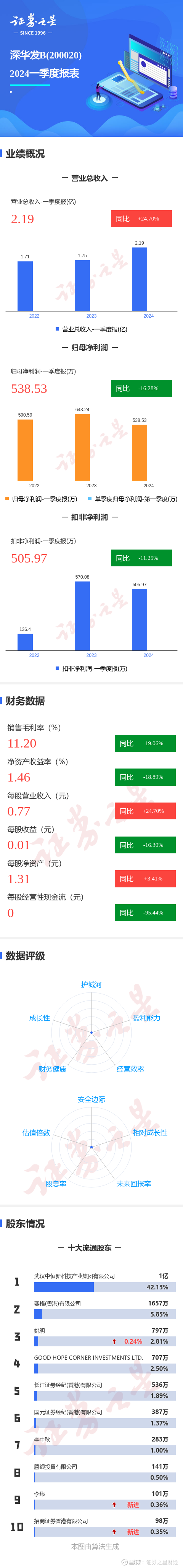 证券之星消息,深华发B2024年一季报显示,公司主营收入2.19亿元,同比上升24.7%;归母净利润538.53万元,同比下降16.28%;扣非净利润505.97万元,同比下降11.25%;负债率37.19%,投资收益12.36万元,财务费用-49.84万元,毛利率11.2%。