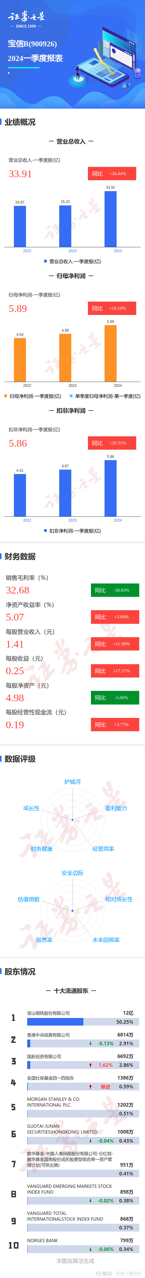证券之星消息,宝信B2024年一季报显示,公司主营收入33.91亿元,同比上升34.44%;归母净利润5.9亿元,同比上升18.19%;扣非净利润5.86亿元,同比上升20.31%;负债率42.69%,投资收益-187.33万元,财务费用-1775.5万元,毛利率32.68%。