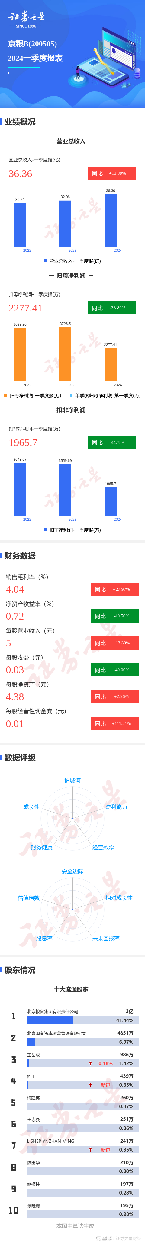 证券之星消息,京粮B2024年一季报显示,公司主营收入36.36亿元,同比上升13.39%;归母净利润2277.42万元,同比下降38.89%;扣非净利润1965.71万元,同比下降44.78%;负债率48.9%,投资收益619.52万元,财务费用1031.48万元,毛利率4.04%。
