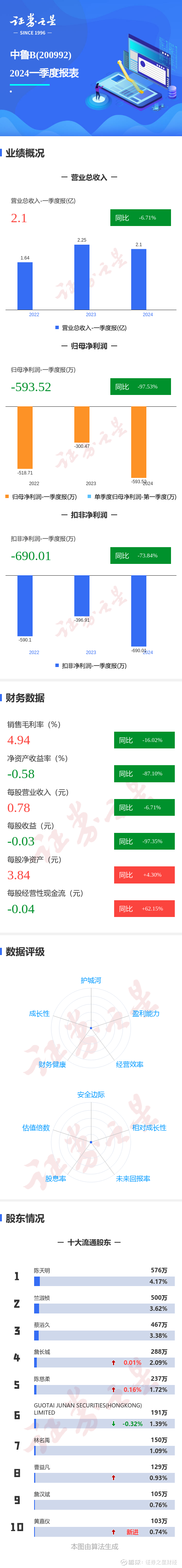 证券之星消息,中鲁B2024年一季报显示,公司主营收入2.1亿元,同比下降6.71%;归母净利润-593.53万元,同比下降97.53%;扣非净利润-690.01万元,同比下降73.84%;负债率38.96%,投资收益-17.61万元,财务费用555.01万元,毛利率4.94%。