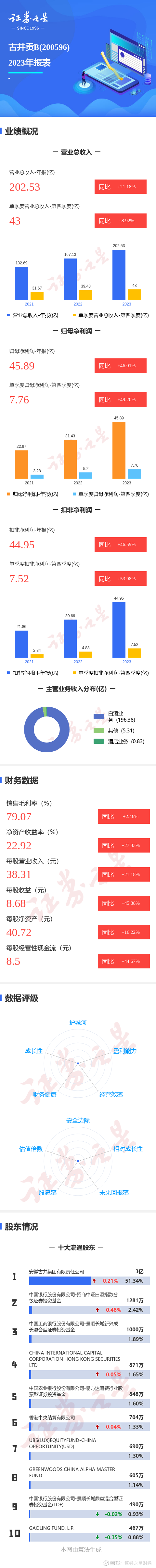 证券之星消息,古井贡B2023年年报显示,公司主营收入202.54亿元,同比上升21.18%;归母净利润45.89亿元,同比上升46.01%;扣非净利润44.95亿元,同比上升46.59%;其中2023年第四季度,公司单季度主营收入43.01亿元,同比上升8.92%;单季度归母净利润7.77亿元,同比上升49.2%;单季度扣非净利润7.52亿元,同比上升53.98%;负债率36.72%,投资收益-633.81万元,财务费用-1.62亿元,毛利率79.07%。