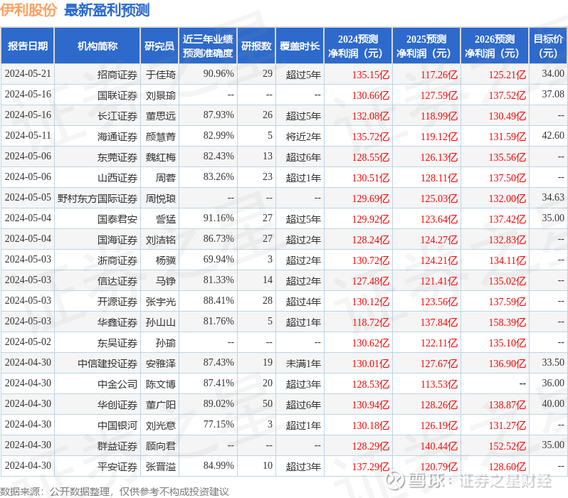 伊利股份(600887) 24Q1收入增速放缓,成本下行驱动利润率提升:2024年一季度公司收入、净利润分别为324.6/59.5亿元,同比-2.6%/+64.7%,扣非净利润为37.3亿元,同比+7.97%,其中期内因处置非流动性资产产生一次性收益25.6亿元。期内公司毛利率35.8%,同比+2pct,销售/管理/研发/财务费用率分别同比+1.4/+0.3/0/-0.6pct,归母净利润率18.2%,同比+7.4pct,扣非归母净利润率11.5%,同比+1.5pct。 液奶业务短期承压,奶粉业务有望加速:液体乳业务自2024年以来面临波动:春节期间,由于礼赠类产品需求旺盛,销售表现良好。然而,节后社会消费信心迅速下降,加之去年高基数的影响,公司业绩增速明显减缓。根据市场调研,行业淡季期间,公司通过提升渠道产品新鲜度和实施产品差异化策略,积极改善市场健康度。因此,我们预计二季度随着发货节奏的减缓,报表端可能继续面临压力。但是,随着下半年渠道信心的逐步提升和中秋国庆旺季的到来,公司业绩预计将恢复稳健增长。奶粉业务,尽管婴配粉在24年第一季度因高基数预计略有下滑,但终端动销表现优于报表端。鉴于2024年龙年生肖的加持,预计全国出生率同比将有所改善,同时行业清库存影响将消退,公司婴配粉全年有望实现较好的增长。成人粉业务,公司通过不断加大产品功能性创新和渠道拓展,近年来持续保持行业领先优势,预计未来将维持双位数以上的增速。奶酪业务短期内面临行业下行压力,2C业务可能继续承压。今年,公司预计将通过产品创新解决品类单一问题,并通过持续拓展2B市场,促进业务的稳定增长。冷饮业务在24年第一季度保持了良好的增长势头。预计随着公司继续深耕下线城市市场、探索新的消费场景,以及东南亚国际市场的快速增长,冷饮业务未来将保持长期稳定的增速。 高分红叠加回购注销计划:公司成功派发2023财年现金分红共计76.4亿元,占当年归母净利润比率为73.3%,同比+2.9pct,至今公司已连续5年分红比率维持超70%水平。基于公司长期业绩的稳健发展态势和良好的现金流状况,我们预计公司未来有望每年延续较高的分红计划。与此同时,公司宣告将以10-20亿元自有资金通过集中竞价交易方式,回购并注销公司股份,以此提升股东回报。截至报告期,公司尚未开始实施上述股份回购。 目标价31.91元,买入评级:综上所述,我们预计公司2024-2026年分别有望实现净利润135.5/126.8/140.4亿元,给予目标价31.91元,相当于2024年盈利预测15倍PE,距离当前有17.9%预期涨幅,买入评级。 重要风险:1)食品安全;2)行业竞争加剧;3)经济恢复不及预期。