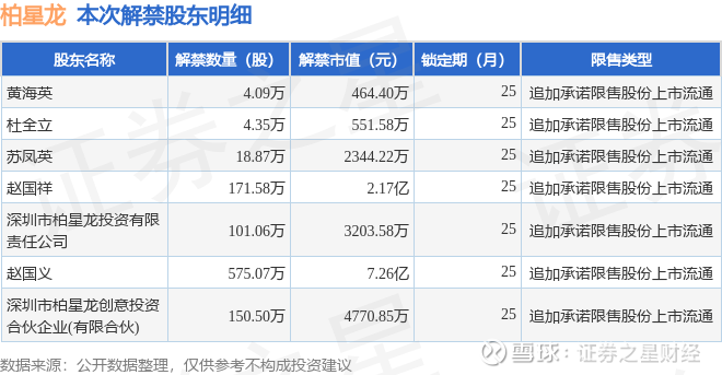 证券之星消息,根据市场公开信息整理,柏星龙(833075)于1月20日将有1025.51万股限售股份解禁,为公司追加承诺限售股份上市流通,占公司总股本15.82%。(本次数据根据历史公告整理得出,实际情况以上市公司最新公告为准)本次解禁后,公司还有2993.61万股限售股份,占总股本46.19%。具体如下图所示: