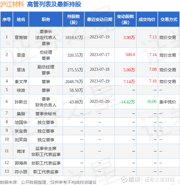 沪江材料的高管列表及最新持股情况如下: