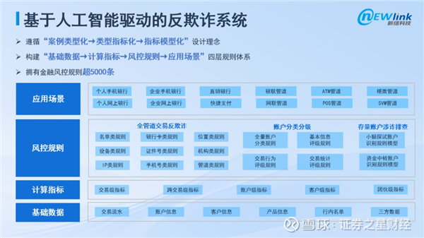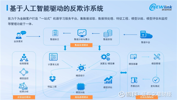 以近期新纽科技面向客户市场推广的“基于人工智能驱动的反欺诈系统”解决方案(以下简称“该方案”)为例。新纽科技基于“数据获取困难”、“欺诈手段多样”、“风险识别难度大”等当下金融行业反欺诈识别与治理的几大难点,积极通过大数据分析、数据可视化和人工智能等创新技术的融合应用,致力于为客户提供兼具感知、决策、管控、学习等功能模块,同时集数据读取、数据预处理、特征识别、模型评估和监控等为一体的“一站式”智能反欺诈服务。