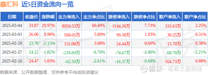 证券之星消息,鑫汇科3月4日涨停收盘,收盘价33.87元。该股于9点32分涨停,未打开涨停,截止收盘封单资金为8538.21万元,占其流通市值8.77%。
