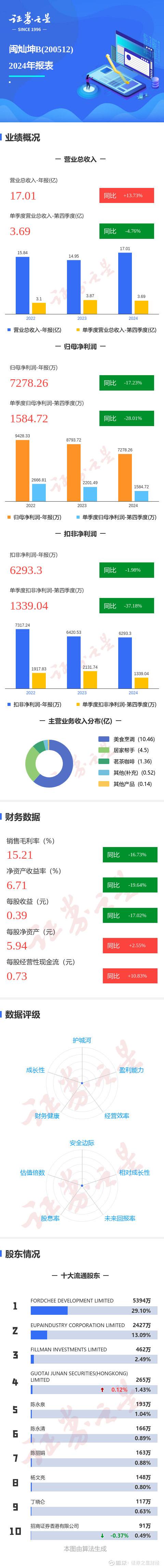 证券之星消息,闽灿坤B2024年年报显示,公司主营收入17.01亿元,同比上升13.74%;归母净利润7278.26万元,同比下降17.23%;扣非净利润6293.3万元,同比下降1.98%;其中2024年第四季度,公司单季度主营收入3.69亿元,同比下降4.76%;单季度归母净利润1584.72万元,同比下降28.02%;单季度扣非净利润1339.05万元,同比下降37.19%;负债率40.46%,投资收益3767.86万元,财务费用138.77万元,毛利率15.21%。