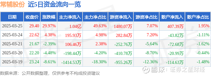 证券之星消息,常辅股份3月25日涨停收盘,收盘价29.4元。该股于9点34分涨停,未打开涨停,截止收盘封单资金为4433.51万元,占其流通市值3.56%。