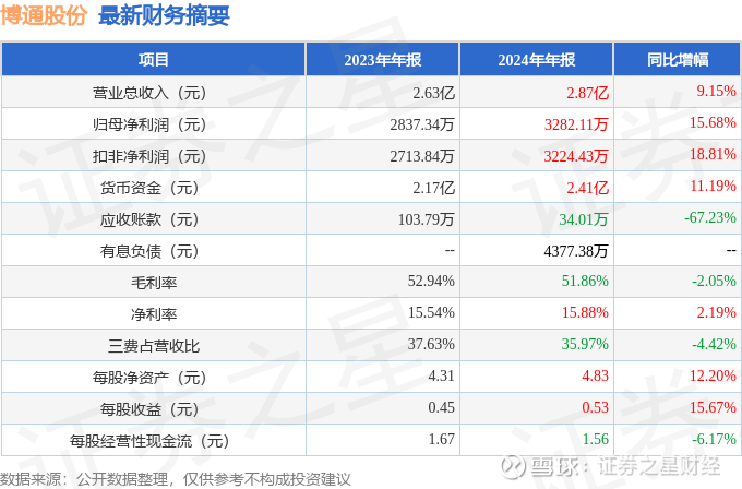 据证券之星公开数据整理,近期博通股份(600455)发布2024年年报。根据财报显示,博通股份营收净利润同比双双增长。截至本报告期末,公司营业总收入2.87亿元,同比上升9.15%,归母净利润3282.11万元,同比上升15.68%。按单季度数据看,第四季度营业总收入7558.89万元,同比上升7.79%,第四季度归母净利润990.4万元,同比上升8.83%。