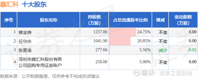 根据鑫汇科2024年年报公布的十大股东详情如下: