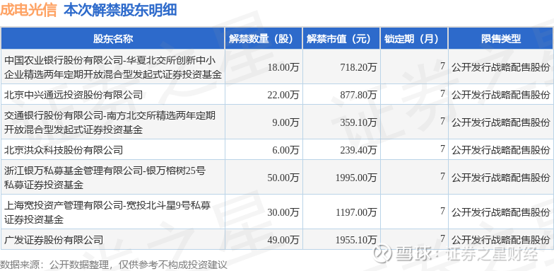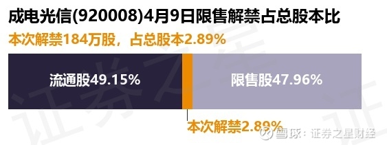 证券之星消息,根据市场公开信息整理,成电光信(920008)于4月9日将有184.0万股限售股份解禁,为公司公开发行战略配售股份,占公司总股本2.89%。(本次数据根据历史公告整理得出,实际情况以上市公司最新公告为准)最近一年内,该股累计解禁746.11万股,占总股本的11.7%。本次解禁后,公司还有3057.57万股限售股份,占总股本47.96%。具体如下图所示: